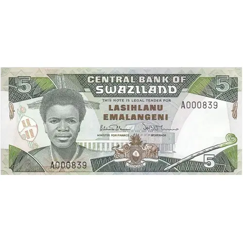 | Leyenda del anverso | Central Bank of Swaziland This note is legal tender for Lasihlanu 5 Emalangeni (Translation: Central Bank of Swaziland This note is legal tender for Five 5 Emalangeni) |