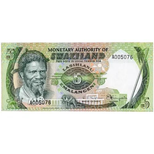 | Reverse lettering | MONETARY AUTHORITY OF SWAZILAND FIVE EMALANGENI |