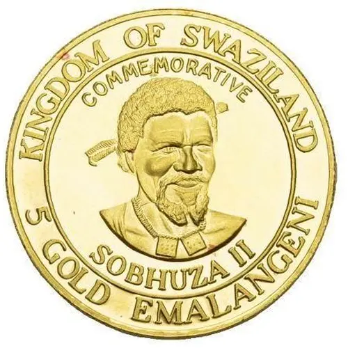 | Obverse lettering | KINGDOM OF SWAZILAND COMMEMORATIVE SOBHUZA II 5 GOLD EMALANGENI |
