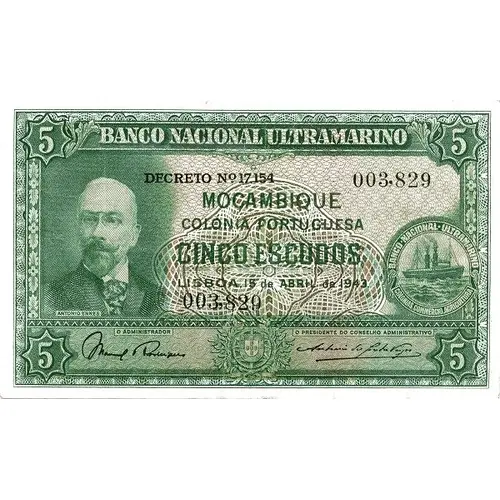 | Obverse lettering | BANCO NACIONAL ULTRAMARINO MOÇAMBIQUE COLONIA PORTUGUESA CINCO ESCUDOS |