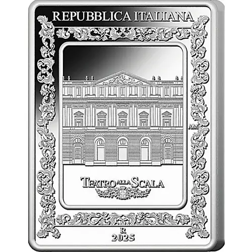 In the centre, within a 19-century-inspired frame, a view of the Teatro alla Scala in Milan with its official logo at the bottom. At the top, the inscription `REPUBBLICA ITALIANA`; at the bottom `R`, identifying the Mint of Rome and `2025`, the year of the coin’s issue. On the right `AM`, initial of the engraver Annalisa Masini. |