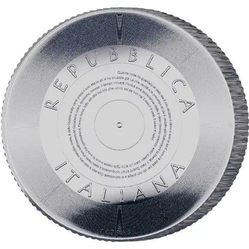 | Obverse description | Representation of a vinyl record with, in the centre, the lyrics of the song “IL CIELO”, composed by the singer-songwriter Renato Zero. Arch-shaped, the inscription “REPUBBLICA ITALIANA”; at the bottom, the signature of the designer “PETRASSI”. |