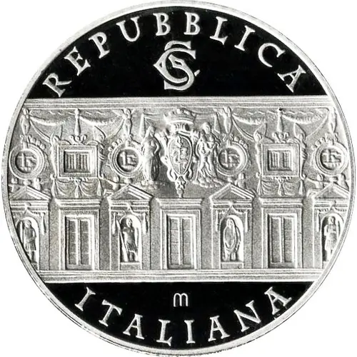 | Reverse description | Representation in prospective of the collonade by Borromini, renowned for the optical illusion and the main architectonic element of Palazzo Spada in Rome. At sides the years of the anniversary, while below the value and the mint mark. |