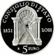 | Reverse lettering | CONSIGLIO DI STATO 1831 2011 5 EURO R (Translation: Council of State) |