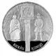 The Peniķi column with Ķoniņciems` coat of arms is featured vertically along the diameter of the coin; a woman dressed in the folk costume and a man with a sword are placed to the left and right of it respectively. In the background, the names of the seven free villages of Courland are inscribed: KALĒJI, ZIEMEĻI, VIESALGI, ĶONIŅI, PLIĶI, DRAGŪNI and SAUSGAĻI. The lower part of the coin bears a semi-circled inscription KURŠU ĶONIŅI. |