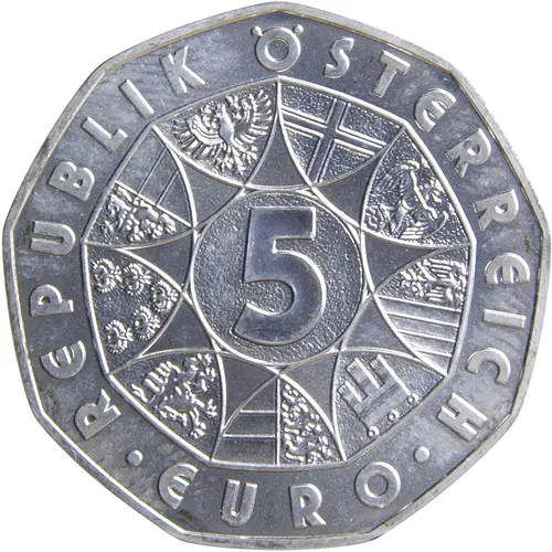 | Obverse description | The nine coats of arms of the Austrian provinces surround the `5` of the face value `5 EURO`. Around the coats of arms is the inscription `REPUBLIK ÖSTERREICH` (Republic of Austria). The design is directly inspired by the old Austrian 50 schilling coins. |