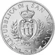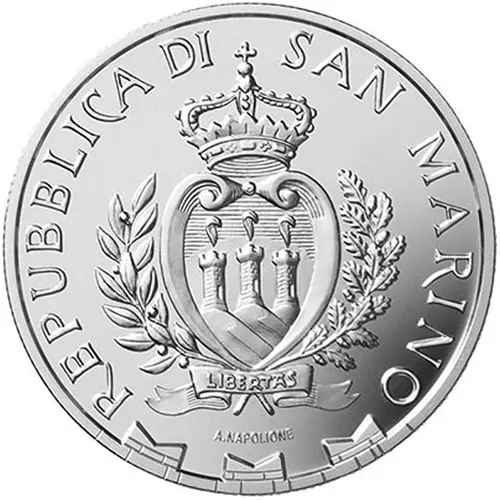| Obverse description | Surrounded by the name of the issuing country REPUBBLICA DI SAN MARINO (in French RÉPUBLIQUE DE SAINT-MARIN), the coat of arms of the microstate, with the three towers Guaita, Cesta and Montale Argent, each surmounted by a feather Argent, on a sky Azure, erected on the hills of Mt, within an oval frame Or surmounted by a wreath Or, between a laurel branch Vert bearing fruit Or to the left and an oak branch Vert bearing fruit Or to the right, the base covered by a banner Argent inscribed `LIBERTAS` Sable; Engraver`s signature `A. NAPOLIONE` in exergue. |