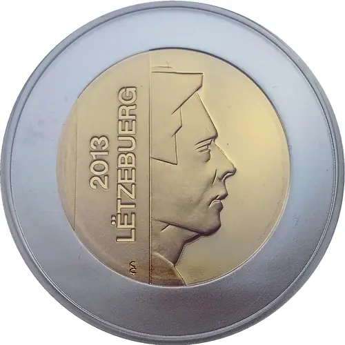 | توضیحات روی سکه | On the right half, a geometrically drawn portrait of His Royal Highness Grand Duke Henri is accompanied on the left half by the inscription: `LËTZEBUERG 2013`. |