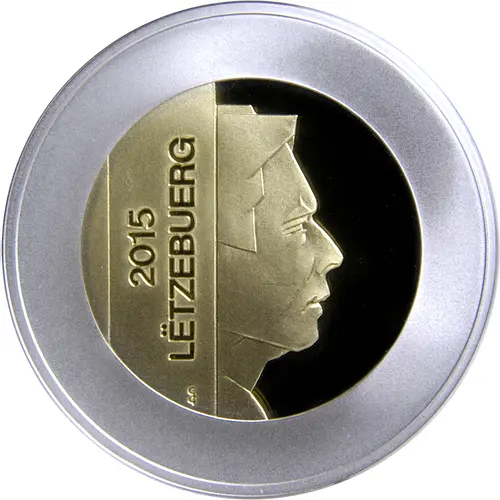 | Opis awersu | On the right half, a geometrically drawn portrait of His Royal Highness Grand Duke Henri is accompanied on the left half by the inscription: `LËTZEBUERG 2015`. |
