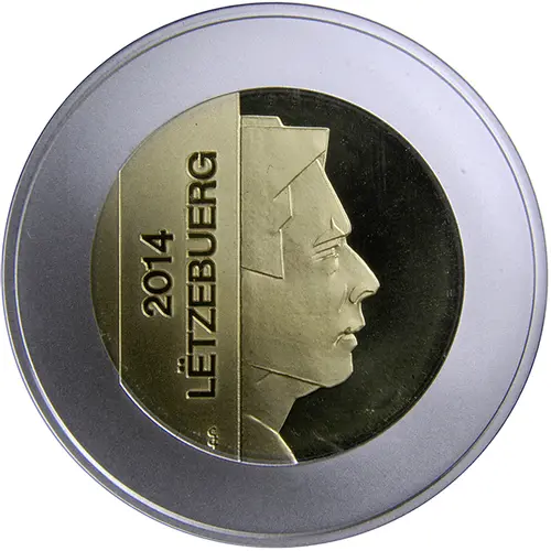 | توضیحات روی سکه | On the right half, a geometrically drawn portrait of His Royal Highness Grand Duke Henri is accompanied on the left half by the inscription: `LËTZEBUERG 2014`. |
