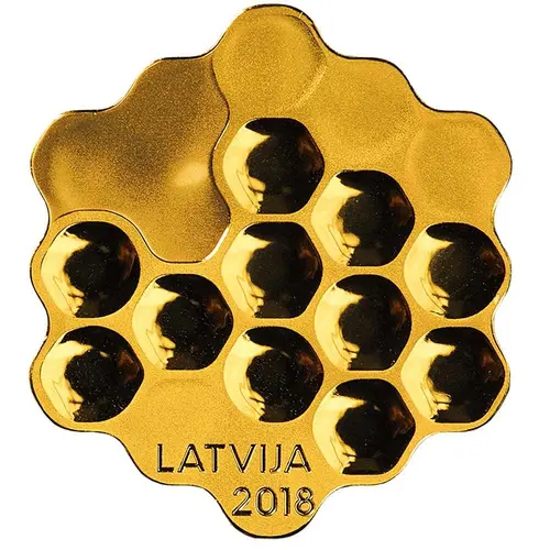 | Obverse description | Honeycomb cells form a rough outline of the geographic contour of Latvia and the Gulf of Riga. Various types of frosting are applied to achieve this effect. The inscription LATVIJA is placed in the lower left part of the coin, with the year 2018 below it. |