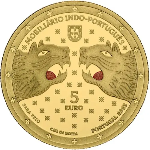 | Obverse lettering | MOBILIÁRIO INDO – PORTUGUÊS 5 EURO SARA FEIO CASA DA MOEDA PORTUGAL 2023 |