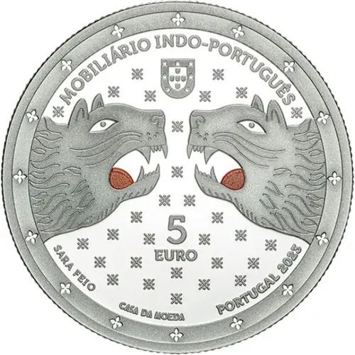| Obverse lettering | MOBILIÁRIO INDO – PORTUGUÊS 5 EURO SARA FEIO CASA DA MOEDA PORTUGAL 2023 |