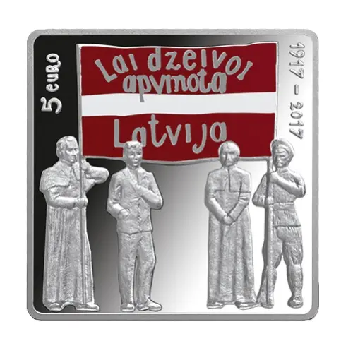 | توضیحات روی سکه | The obverse shows the representatives of various strata of society – participants of the Latgale Congress of Latvians, carrying a red-white-red poster calling for the unification of Latvia. The inscriptions `5 euro` and `1917–2017` are placed on the top left and right respectively. |