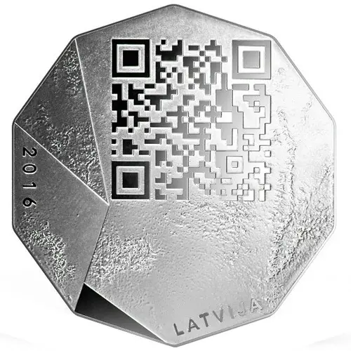 A QR code containing a message for the coming generation is featured at the top, with the year 2016 on the left and the inscription LATVIJA at the bottom part of the obverse. |
