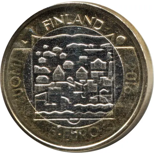 | Obverse description | Landscape of Finnish countryside, framing an open book depicting a built urban environment |