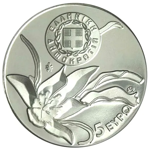 | Description de l’avers | A flower form of the Tulipa Goulimyi is depicted and above it, is the insignia/emblem of the Hellenic Republic along with a palmette (the mint mark of the Greek Mint). Inscribed on the lower right side is the wording “5 EURO” (in Greek) along with the monogram of the engraver (M.Antonatou). |