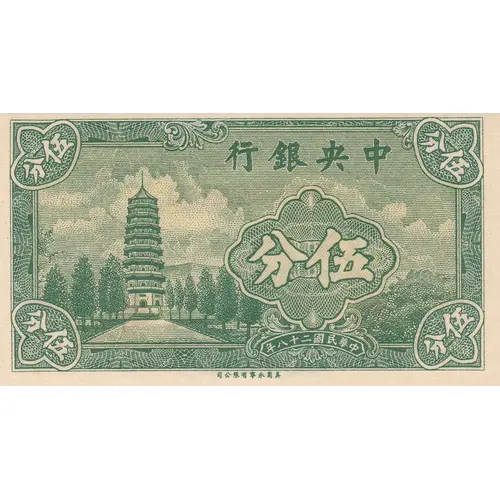 | Reverse lettering | THE CENTRAL BANK OF CHINA FIVE CENTS UNION PUBLISHERS & PRINTERS, FED. INC. U.S.A. |