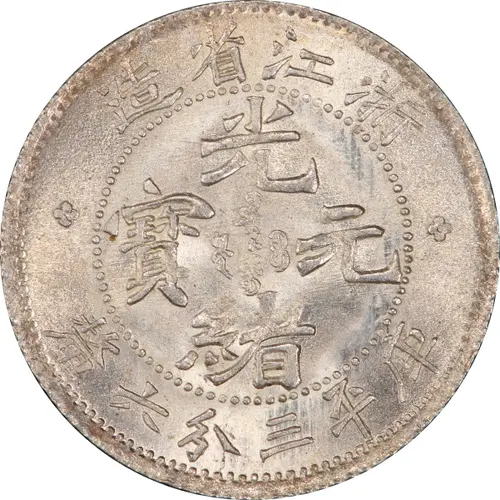造省江浙 光 ᠪᠠᡩᠠᡵᠠᠩᡤᠠ 寶 ᠶᡠᠸᠠᠨ ᠪᠣᠣ 元 ᡩᠣᡵᠣ 緒 釐六分三平庫 (Translation: Made in Chekiang Province Guangxu (Emperor) / Yuanbao (Original currency) Guangxu (Emperor) / Yuanbao (Original currency) Worth 3.6 Candareens (weight)) |