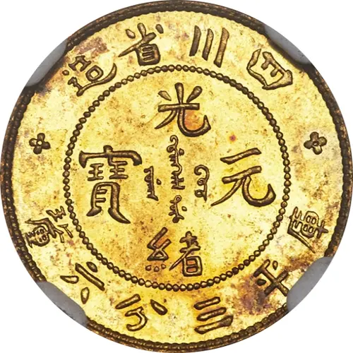 造省川四 光 ᠪᠠᡩᠠᡵᠠᠩᡤᠠ 寶 ᠶᡠᠸᠠᠨ ᠪᠣᠣ 元 ᡩᠣᡵᠣ 緒 釐六分三平庫 (Translation: Made in Szechuan Province Guangxu (Emperor) / Yuanbao (Original currency) Guangxu (Emperor) / Yuanbao (Original currency) Worth 3.6 Candareens (weight)) |