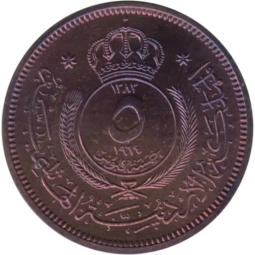 | Reverse lettering | THE HASHEMITE KINGDOM OF JORDAN FIVE FILS 5 1964 |