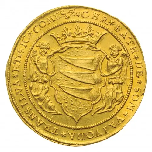 Historical Context: This impressive 1577 5 Florins gold coin was issued during the reign of Kristóf Báthori, Prince of Transylvania (1576-1581). His rule coincided with a pivotal era for the principality, serving as regent while his brother, Stephen Báthori, ascended to the Polish throne. Kristóf’s tenure was marked by efforts to stabilize Transylvania's semi-independent status amidst the geopolitical pressures of the Ottoman Empire and the Habsburgs, asserting the Báthori dynasty's growing influence and wealth through such significant gold issues.
