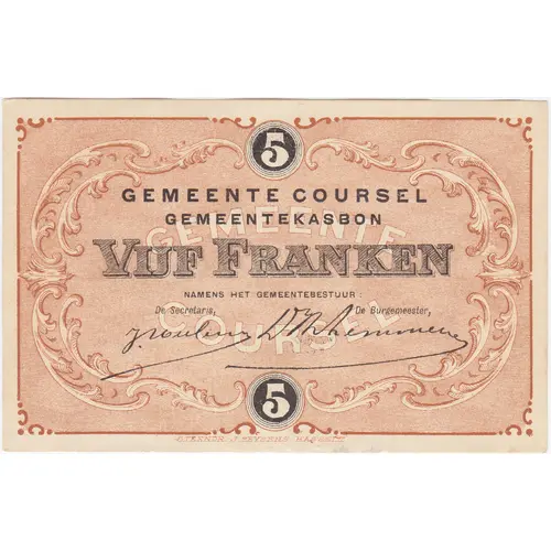 | 正面铭文 | 5 GEMEENTE COURSEL GEMEENTEKASBON VIJF FRANK NAMENS HET GEMEENTEBESTUUR De Secretaris, De Burgemeester, (2 signatures) 5 |