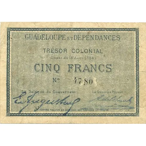 | Legenda awersu | GUADELOUPE ET DÉPENDANCES TRÉSOR COLONIAL (Décret du 18 Août 1884.) CINQ FRANCS. Le contre-valeur en espèces est déposée au Trésor. (Translation: Guadeloupe and Dependencies Colonial Treasure (Decree of August 18, 1884.) Five Francs. The cash equivalent is deposited in the Treasury.) |