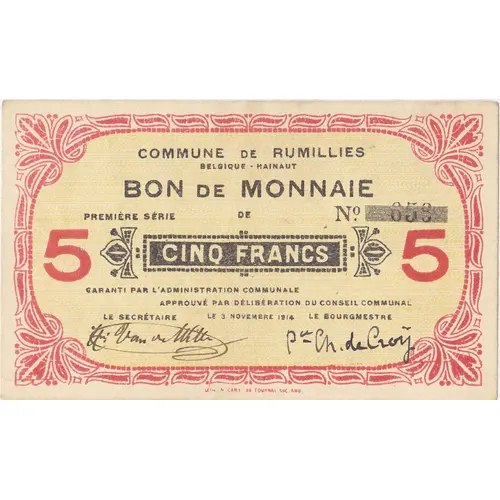 COMMUNES DE RUMILLIES BELGIQUE - HAINAUT BON DE MONNAIE PREMIÈRE SÉRIE DE N* 658 5 CINQ FRANCS 5 GARANTI PAR L`ADMINISTRATION COMMUNALE APPROUVÉ PAR DÉLIBÉRATION DU CONSEIL COMMUNAL LE SECRETAIRE LE 3 NOVEMBRE 1914 LE BOURGMESTRE (signature) (signature) LITH. & CART. DE TOURNAI SOC. ANO. |