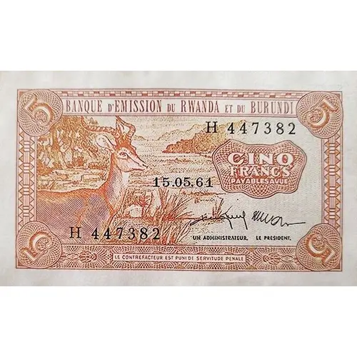 | Obverse lettering | BANQUE D`EMISSION DU RUANDA ET DU BURUNDI CINQ FRANCS PAYABLES A VUE LE CONTREFACTEUR EST PUNI DE SERVITUDE PENALE |