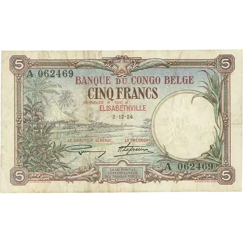 | Obverse lettering | BANQUE DU CONGO BELGE CINQ FRANCS PAYABLE A VUE A LA LOI PUNIT LE CONTRAFACTEUR DES TRAVAUX FORCES J. VERPLANCKE INV M. POORTMAN GRAV. |