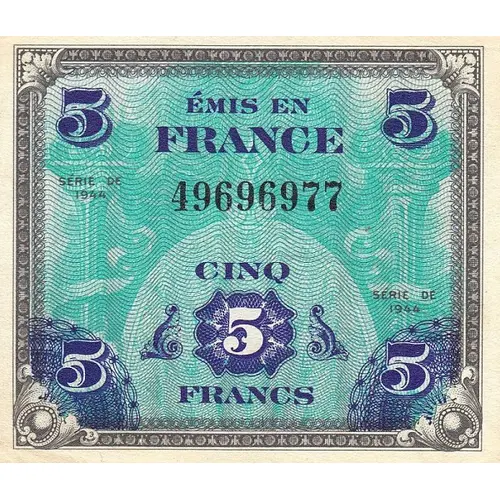 | Obverse lettering | ÉMIS EN FRANCE CINQ FRANCS (Translation: Issued in France Five Francs) |