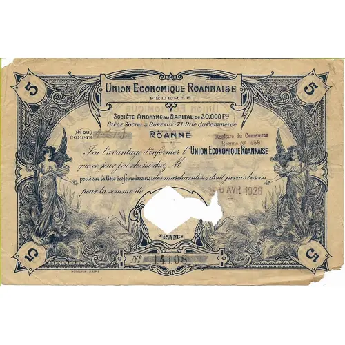 | Obverse lettering | 5 | UNION ECONOMIQUE ROANNAISE FÉDÉRÉE | 5 SOCIÉTE ANONYME AU CAPITAL DE 30.000 Fcs. SIÈGE SOCIAL & BUREAUX : 71 , Rue du Commerce N° DU COMPTE 1710 | ROANNE | Registre du Commerce Roanne N° 459 J`ai l`avantage d`informer l` UNION ECONOMIQUE ROANNAISE que ce jour j`ai choisi chez M porté sur la liste des fournisseurs des marchandises dont j`avais besoin pour la somme de 5 FRANCS | 6 AVRIL 1928 5 | N° 14108 | 5 BOURQUIN - REIMS |