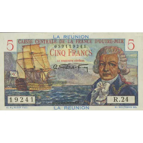 | Opis líce | LA REUNION CAISSE CENTRALE DE LA FRANCE D`OUTRE-MER CINQ FRANCS LE DIRECTEUR GÉNÉRAL BOUGAINVILLE LA REUNION G. A. KLEIN FEC. G. BELTRAND SC. (Translation: Reunion Central Fund of Overseas France Five Francs Bougainville Reunion) |