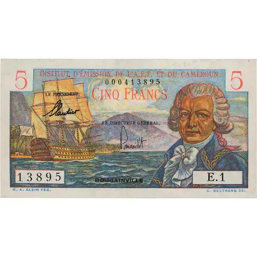 INSTITUT D`EMISSION DE L`A.E.F. ET DU CAMEROUN CINQ FRANCS BOUGAINVILLE G. A. KLEIN FEC. G. BELTRAND SC. (Translation: Emission Institute of French Equatorial Africa and Cameroon Five Francs) |