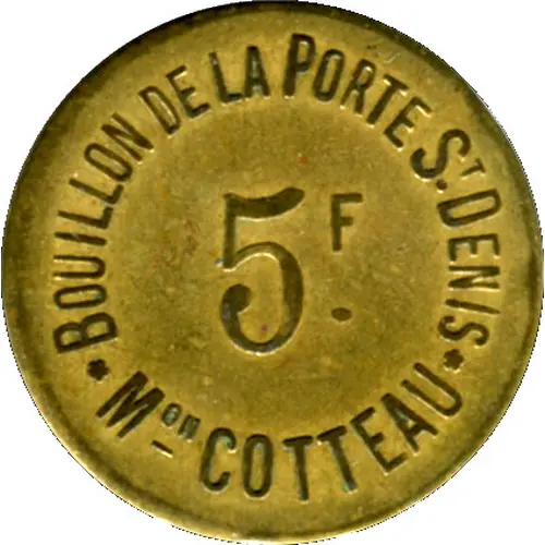 | Obverse lettering | Bouillon de la Porte Saint-Denis 5 F Mon Cotteau |