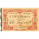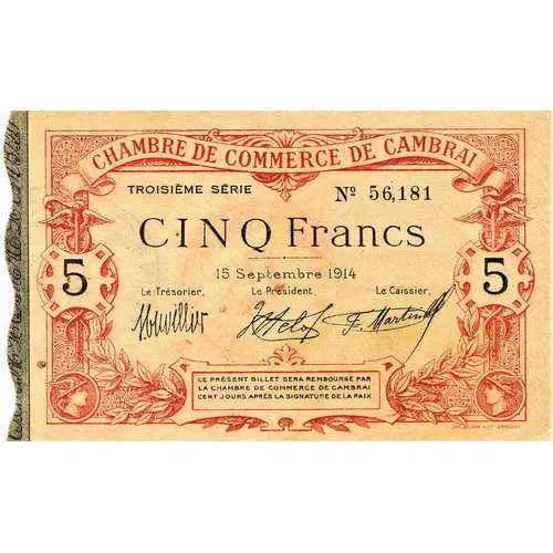 | Obverse lettering | CHAMBRE DE COMMERCE DE CAMBRAI TROISIEME SERIE N° 56,181 CINQ FRANCS 15 SEPTEMBRE 1914 Le Trésorier Le Président Le Caissier Le présent billet sera remboursé par la Chambre de Commerce de Cambrai cent jours après la signature de la paix. IMP. DELIGNE & CIE CAMBRAI |