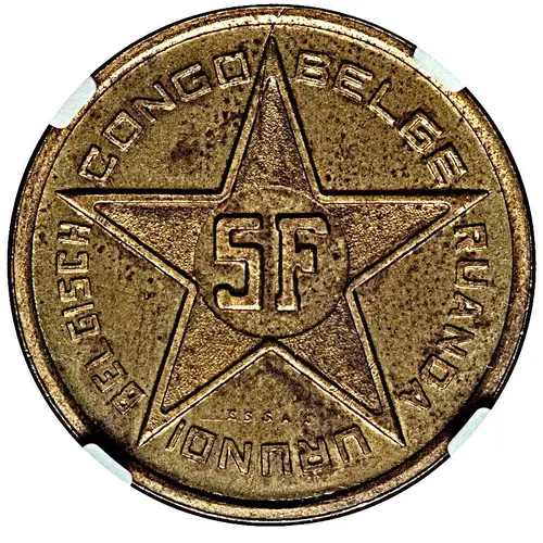 | Obverse lettering | BELGISCH CONGO BELGE 5F ESSAI RUANDA - URUNDI |