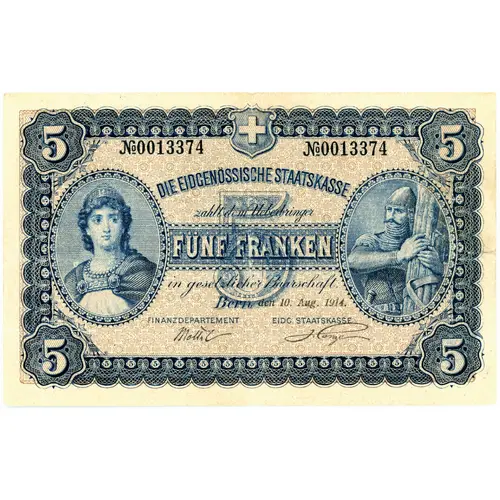 5 5 DIE EIDGENÖSSISCHE STAATSKASSE zahlt dem Ueberbringer FÜNF FRANKEN in gesetzlicher baarschaft. Bern, den 10. Aug. 1914. FINANZ DEPARTEMENT EIDG STAATSKASSE LIBERTAS |