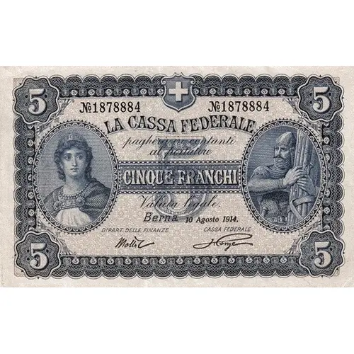 5 5 LA CASSA FEDERALE pagare in contanti al portatore CINQUE FRANCHI valuta legale Berna 10 Agosto 1914. DIPART. DELLE FINANZE CASSA FEDERALE 5 5 |