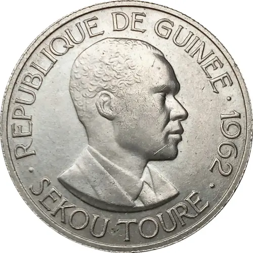 Historical Context: The 1962 5 Francs Guinéens coin represents a pivotal moment in African history, just four years after Guinea declared independence from France in 1958. Under President Ahmed Sékou Touré, Guinea pursued radical nationalism. The introduction of the Guinean Franc in 1960, replacing the CFA Franc, symbolized economic sovereignty and a break from colonial monetary structures. This coin, therefore, is a tangible assertion of national identity and economic independence during the Republic of Guinea's nascent years.