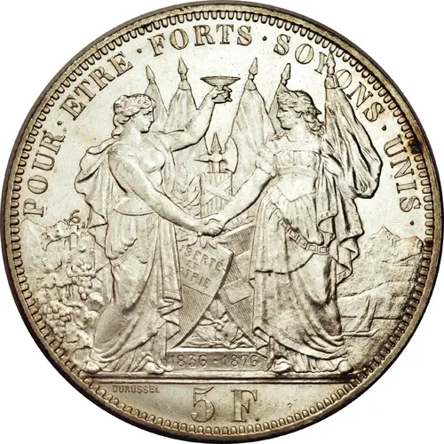 | Obverse lettering | POUR · ETRE · FORTS · SOYONS · UNIS · LIBERTÉ ET PATRIE 1836-1876 DURUSSEL 5 F. (Translation: Let`s be united to be strong Freedom and Homeland 5 Franken) |