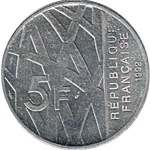 | Obverse lettering | RÉPUBLIQUE FRANÇAISE 1992 5F |