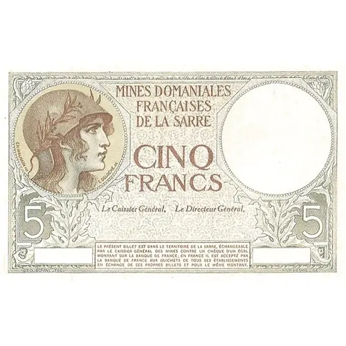 | Obverse lettering | MINES DOMANIALES FRANÇAISES DE LA SARRE CINQ FRANCS 5 | 5 LE PRÉSENT BILLET EST DANS LE TERRITOIRE DE LA SARRE ECHANGEABLE PAR LE CAISSIER GÉNÉRAL DES MINES CONTRE UN CHÈQUE D`UN ÉGAL MONTANT SUR LA BANQUE DE FRANCE ; EN FRANCE IL EST ACCEPTE PAR LA BANQUE DE FRANCE AUX GUICHETS DE TOUS SES ÉTABLISSEMENTS EN ÉCHANGE DE SES PROPRES BILLETS ET POUR LE MÊME MONTANT. GEO. DUVAL. FEC. ROMAGNOL SC |