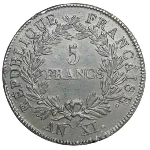 | Description du revers | FRENCH REPUBLIC // 5/ FRANCS/ AN XI. within a crown formed by two olive branches |