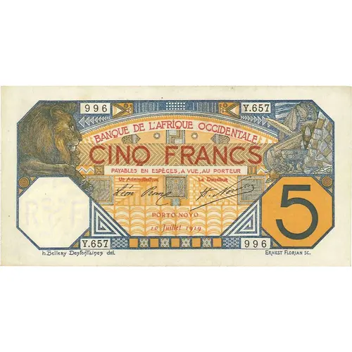 | Legenda del dritto | BANQUE DE L`AFRIQUE OCCIDENTALE CINQ FRANCS PAYABLES EN ESPÈCES, A VUE, AU PORTEUR PORTO-NOVO h.Bellery Desfontaines del. Ernest Florian SC. |