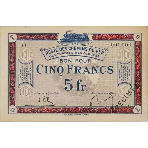 REGIE DES CHEMINS DE FER DES TERRITOIRES OCCUPES BON POUR CINQ FRANCS 5fr. RCFTO | OTFCR VALABLE EN PAIEMENT DE TOUTES SOMMES DUES AUX CHEMINS DE FER OUTLIG ZUR ZAMLUNG ALLER AN DIE EISENBAHNTEN GESCHULDETEN BETRACE RCFTO | OTFCR Impr. PAUL DUPONT. PARIS |