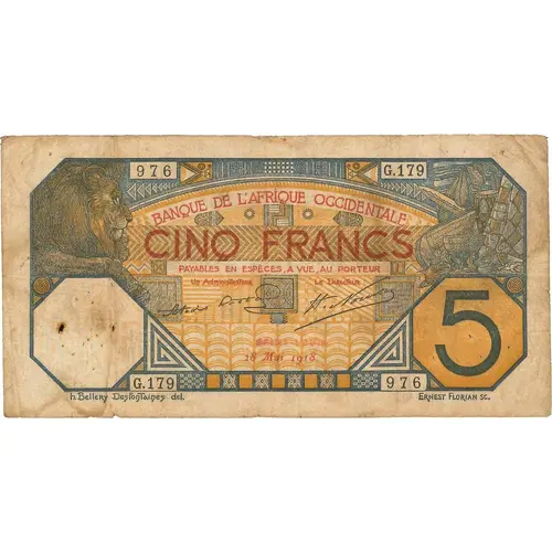 | Obverse lettering | BANQUE DE L`AFRIQUE OCCIDENTALE CINQ FRANCS PAYABLES EN ESPÈCES, A VUE, AU PORTEUR SAINT-LOUIS h.Bellery Desfontaines del. Ernest Florian SC. |