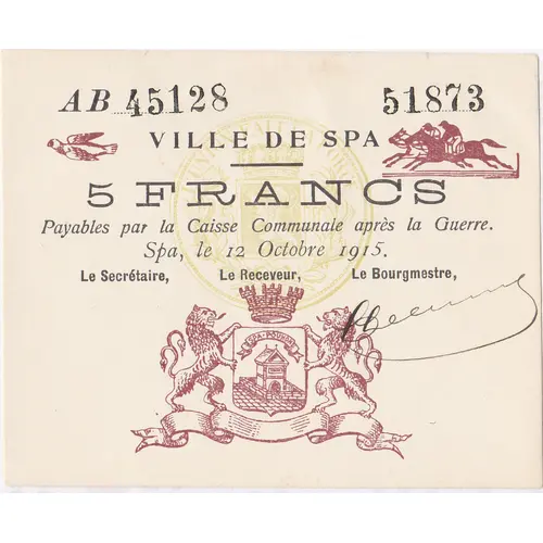 AB 45128 51873 VILLE DE SPA (ligne) 5 FRANCS Payables par la Caisse Communale après la Guerre. Spa, le 12 Octobre 1915. Le secrétaire, Le Receveur, Le Bourgmestre, (signature du Bourgmestre) |
