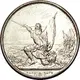 Under a radiant sun, a bearded soldier in armor kneeling and brandishing a sword with his right hand, pointing to the sky and a banner with the Swiss flag in his left hand, his helmet at his feet; behind a landscape and soldiers accompanying him. |